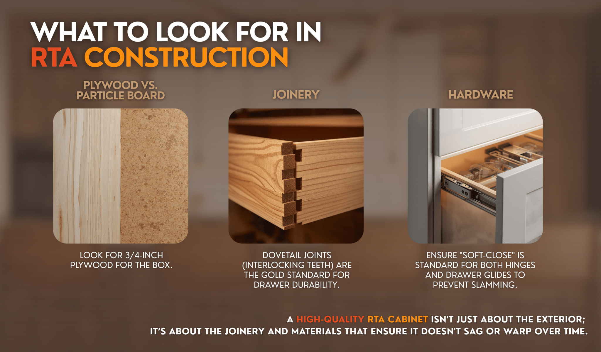 A structurally sound RTA cabinet for residential use should include: 3/4-inch plywood box construction (not particleboard), full dovetail or dowel-and-cam drawer box joinery, soft-close hinges and drawer guides as standard, and a finished interior that holds up to moisture without swelling or delaminating.