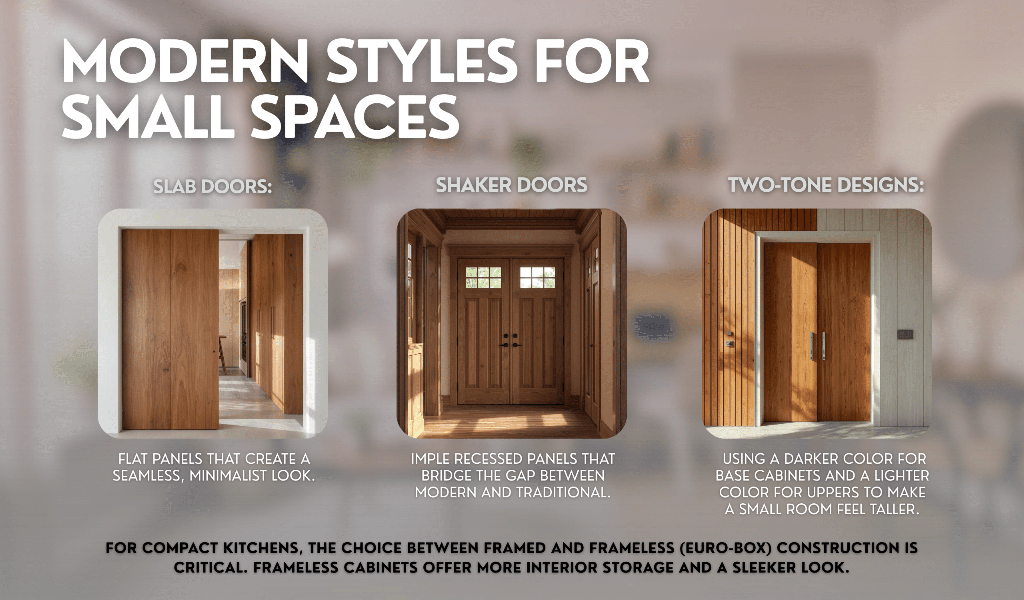 For modern kitchens specifically, frameless (Euro-box) construction allows for wider door openings and cleaner sight lines, which becomes especially important in tight layouts where every inch of access matters.