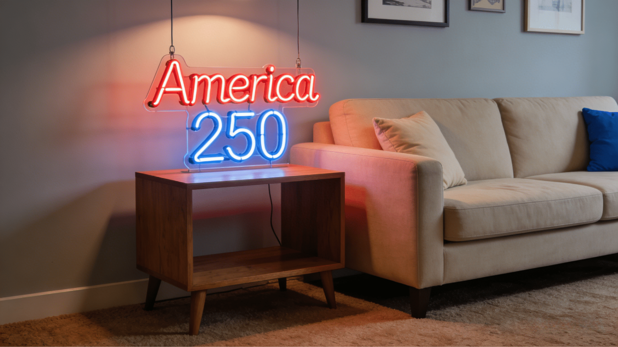 Lighting is an indispensable part of home décor and plays a significant role. It creates ambiance and makes everything feel warmer and more comfortable. Soft string lights, candles, and small table lamps all create a warm, welcoming feeling. If you want to add some more patriotic decor, custom neon signs are a popular choice. You can use ones that show “1776–2026” or “America 250.”